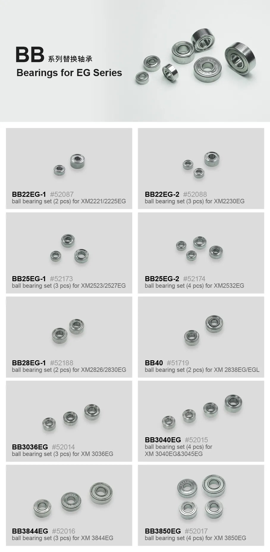 Click for More InformationBall bearing for EG and EGL series motors,BB - BB3850EG, ball bearing set(4 p...SKU: 520175,92 €Price